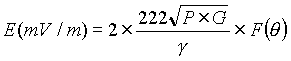 式中: P──发射机功率,KW; G──相对于半波偶极子的天线增益,DB; r──被测点与发射天线的距离,Km; F(θ)──天线垂直面方向性函数(视天线型式和层数而异)。 A.2.5.4 雷达等微波功率密度S计算公式: